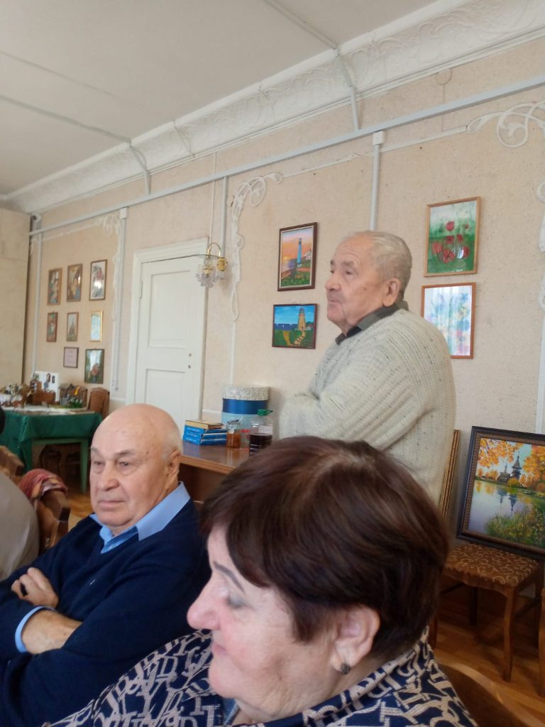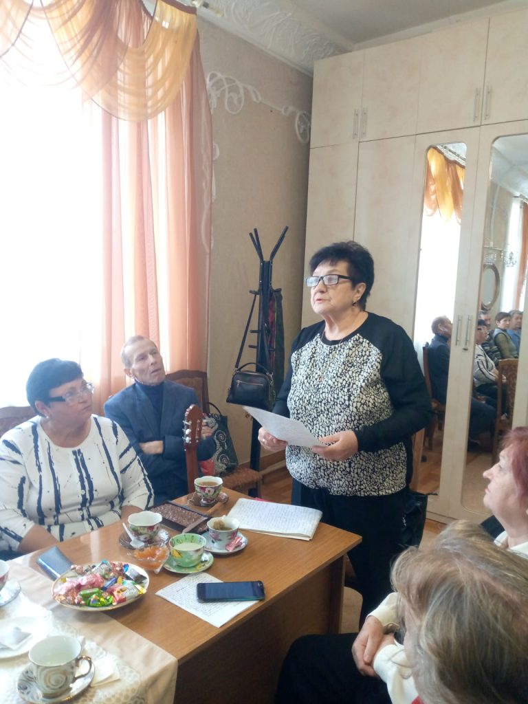С воспоминаниями об ушедших (Доброхотове Евгении Вадимовиче) выступил Рязанов В.М., который также вспомнил о местной газете «Трудовая жизнь», в которой были рубрики «Литературная страничка» и «Радуга природы». К сожалению, сейчас на такое творчество внимание не обращается. Владимир Миронович также продекламировал своё произведение «Ноктюрн». Стихотворение Киселёвой Нины Лаврентьевна «Хожу на переправу» прочла Панюкова З.Ф. (ранее на эти стихи Томин Николай Михайлович написал музыку, песня «живёт» до сих пор). Также о Нине Лаврентьевне очень тепло вспомнила Кожевникова С.Н. О Сергее Владимировиче Феденкове говорили Шкарина Г.И. и Якимова Л.Д., Тарасов О.Ф. Он также рассказал о своей маме (Ремизовой Анне Павловне), преподавателе музыкальной школы, и исполнил о ней песню – посвящение собственного сочинения. Афанасьева В.В. проникновенно читала стихи Соколова Александра Ивановича, Мартыненко Петра Васильевича, Карпова Анатолия Павловича… Все вместе вспоминали о Кубракове Михаиле Кирилловиче, Рудько Григории Константиновиче, Камелиной Людмиле Валентиновне, Томине Николае Михайловиче…