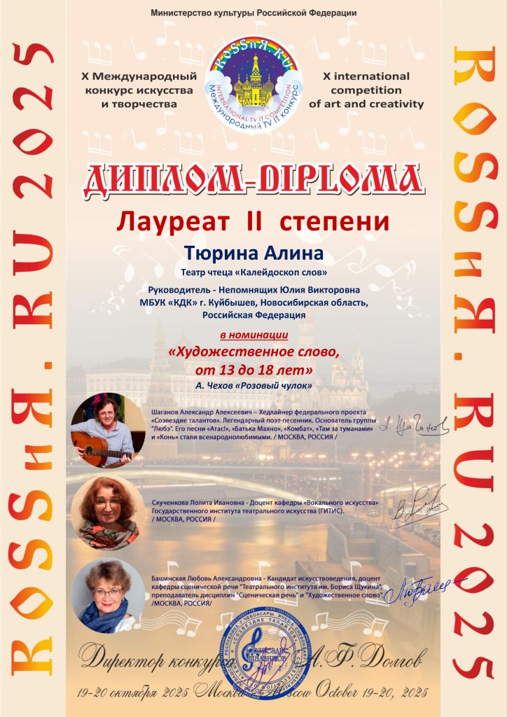 👉Юная актриса театра чтеца «Калейдоскоп слов» МБУК «Культурно-досуговый комплекс» — Тюрина Алина, стала Лауреатом II степени в номинации «Художественное слово» среди участников в возрасте от 13 до 15 лет. Алина представила на суд жюри выразительное исполнение произведения Антона Чехова «Розовый чулок». Ее руководитель, Юлия Викторовна Непомнящих, была отмечена Благодарственным письмом от экспертно-попечительского совета, Организационного комитета и Дирекции конкурса за творческую и духовно направленную работу с конкурсантами.
