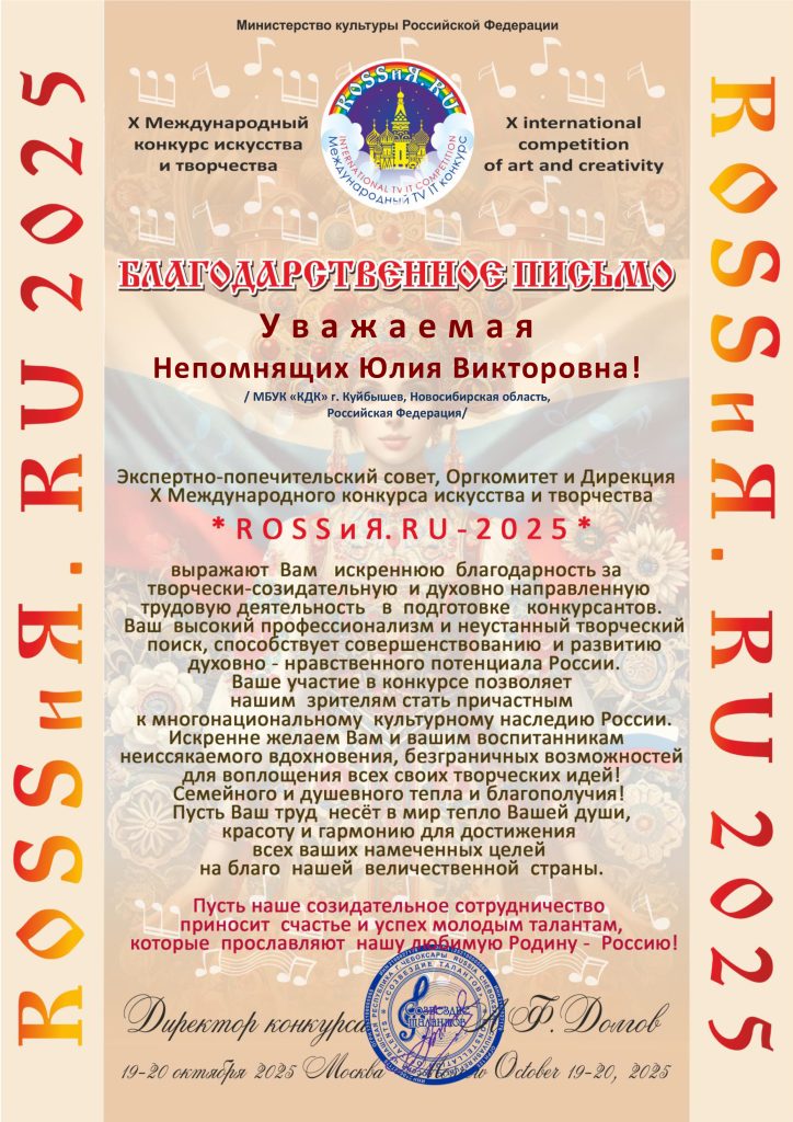 📢19- 20 октября 2025 года в Москве состоялся X Международный конкурс искусства и творчества «ROSSиЯ.RU — 2025″, который прошел в заочной форме при информационной поддержке Министерства культуры Российской Федерации и преподавателей Российской академии музыки имени Гнесиных. В конкурсе приняли участие 731 участник из разных стран и регионов России. Организацию и координацию конкурса осуществлял Российский продюсерский центр «Созвездие талантов».