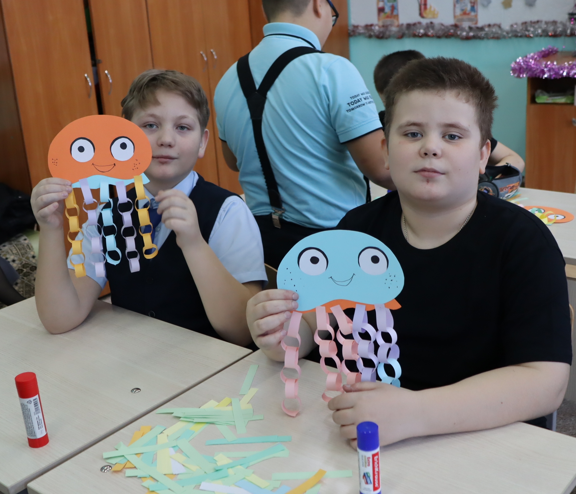 ✂Необходимо было к тельцу медузы приклеить нечётное количество колец, склеенных между собой из цветных полосок бумаги, которые имитировали её красивый и подвижный шлейф. Ребята были увлечены процессом создания, каждый старался сделать шлейф длиннее и оригинальнее скомбинировав цвета.
