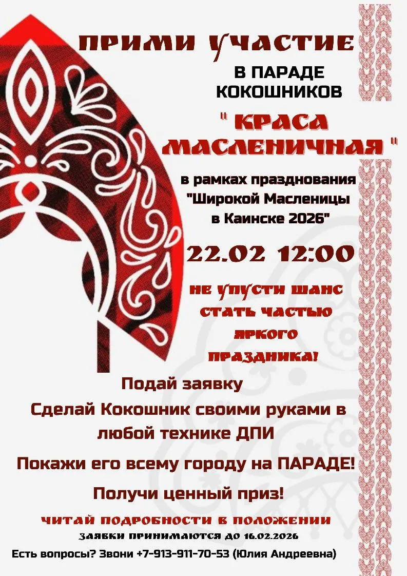 Приглашаем принять участие в Параде кокошников «Краса масленичная» в рамках праздника 🥞 «Широкая Масленица в Каинске 2026»🥞