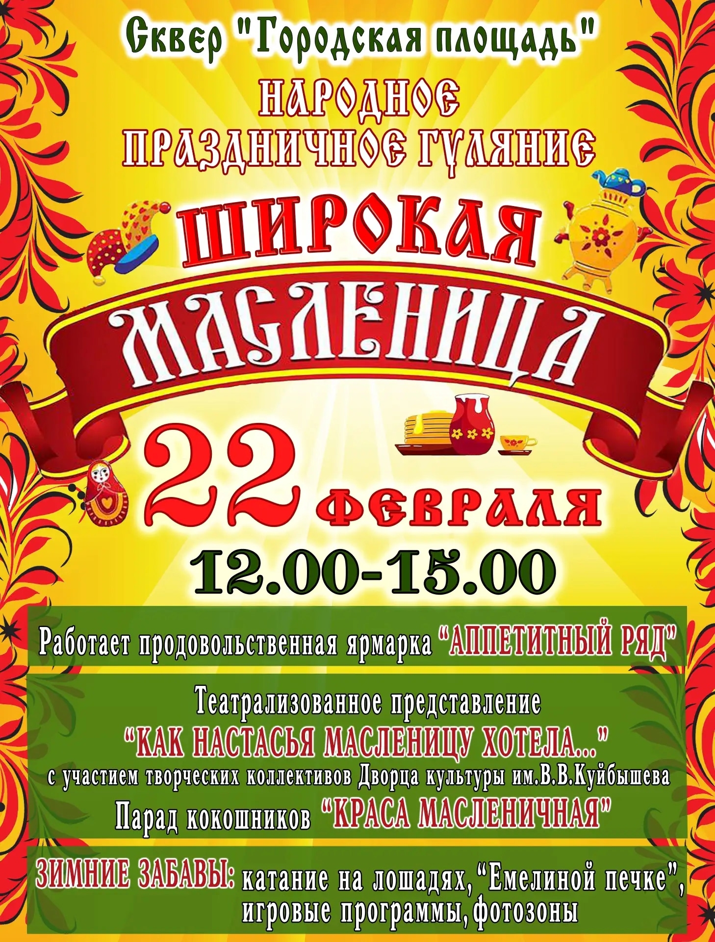 «Широкая Масленица» в Куйбышеве — яркое и радостное событие, которое ежегодно собирает жителей и гостей города, наполняя улицы весельем и интересными представлениями!🥞