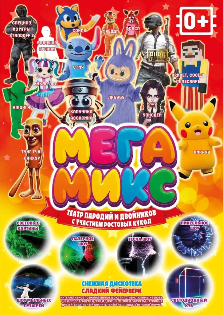 В программе будут участвовать — 15 Ростовых Кукол: Привет сосед Майнкрафт, Пикачу, Соник, Венсдей, Фредди и Фокси с аниматрониками, Кукла Лол , Капучино Ассасино, Лабубу, Тунг Тунг Сахур, Амонгас, Спецназ из игры Стэндофф 2, Пабг и многие другие.