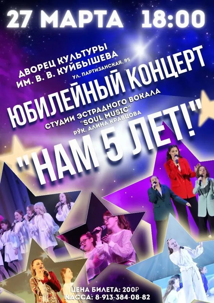 📢Дорогие друзья! Студия эстрадного вокала «Soul music» (руководитель А.Ю. Кравцова) отмечает свой первый юбилей — 5 лет — и дарит зрителям большую сольную программу!