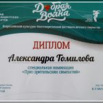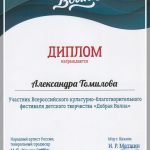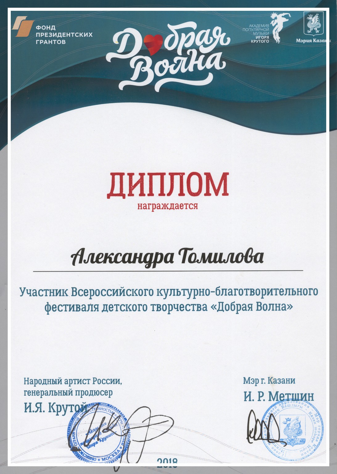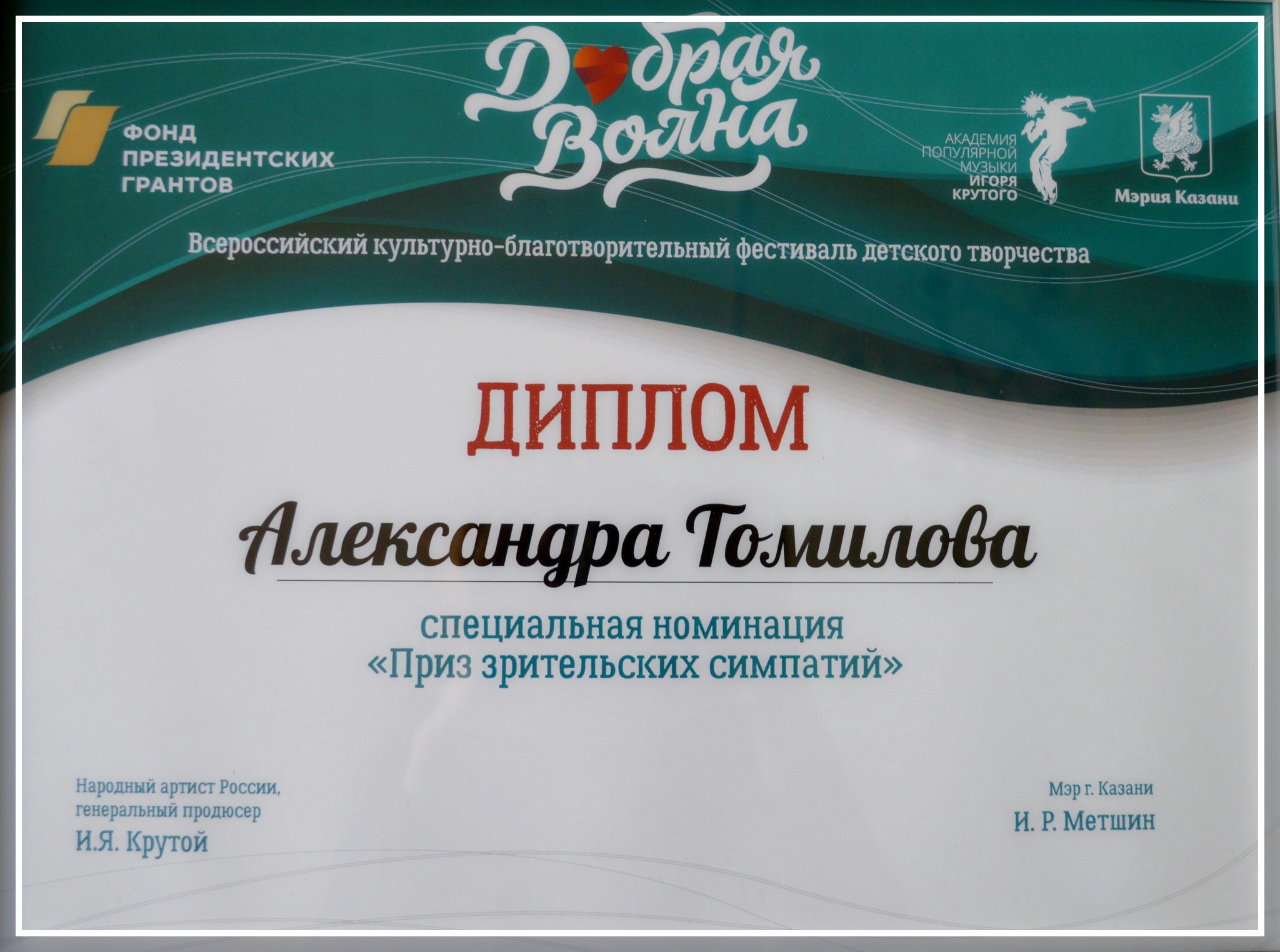 15 августа, в городе Новосибирске, в концертном зале «Евразия», прошёл региональный благотворительный фестиваль детского творчества «Добрая волна», в котором принимала участие воспитанница студии эстрадного вокала «Ассоль», МБУК «КДК» г.Куйбышева, Александра Томилова, руководитель Наталья Геннадьевна Шульская. По словам руководителя, Саша талантливая, целеустремлённая девочка, которая на протяжении нескольких лет занимается эстрадным вокалом, принимает участие в концертах, конкурсах, имеет множество наград. В этом году Александре посчастливилось принять участие в фестивале «Добрая волна», организатором которого является академия популярной музыки Игоря Крутого. По результатам выступления, Александра была награждена дипломом «Приз зрительских симпатий» и памятным подарком. Как говорит сама участница, эта награда послужила стимулом для саморазвития и совершенствования вокальных навыков!