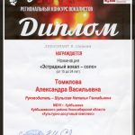 Профессиональное жюри оценивало не только вокальные данные и технику исполнения, но и артистизм, создание сценического образа, взаимодействие со слушателями. Александра Томилова была удостоена диплома II cтепени. Поздравляем Александру с её творческим достижением и желаем дальнейшего успеха!!!