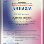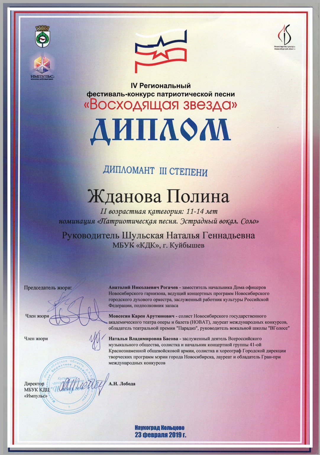 23 февраля 2019 года в наукограде Кольцово состоялся IV Региональный фестиваль -конкурс патриотической песни «Восходящая звезда». Конкурс проводился в целях обогащения и популяризации отечественного песенного творчества гражданской, военной и патриотической тематики, возрождения и сохранения национальных духовных и культурных традиций, преемственности и связи поколений. Учредители и организатора мероприятия — Министерство культуры Новосибирской области, Администрация наукограда Кольцово, Муниципальное бюджетное учреждение культуры Культурно-досуговый центр «Импульс» наукограда Кольцово. Город Куйбышев на фестивале-конкурсе «Восходящая звезда» представляла участница студии эстрадного вокала «Ассоль» МБУК «КДК» Полина Жданова (руководитель Шульская Н.Г.). По итогам конкурса Полина была стала дипломантом III степени. Это был её первый опыт индивидуального участия в выездном конкурсе. От всей души поздравляем Полину, пусть ей всегда и во всем сопутствует удача и вдохновение!